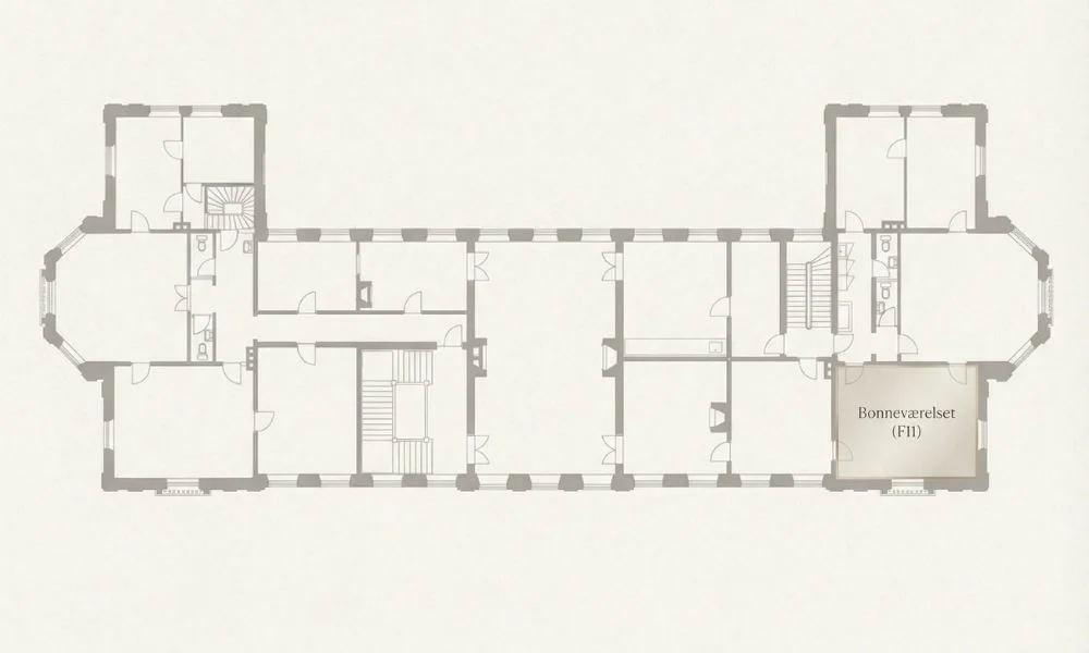 Bonneværelset er et af slottets smukkeste kontorlokaler. Rummet har meget højt til loftet, store vinduer og direkte udsigt mod stranden og parken — et usædvanligt lyst og roligt arbejdsmiljø. Lokalet ligger optimalt på 1. sal tæt på gæsteadgang, toiletter og fællesarealer, hvilket gør det ideelt til teams med både interne arbejdsdage og externe møder.